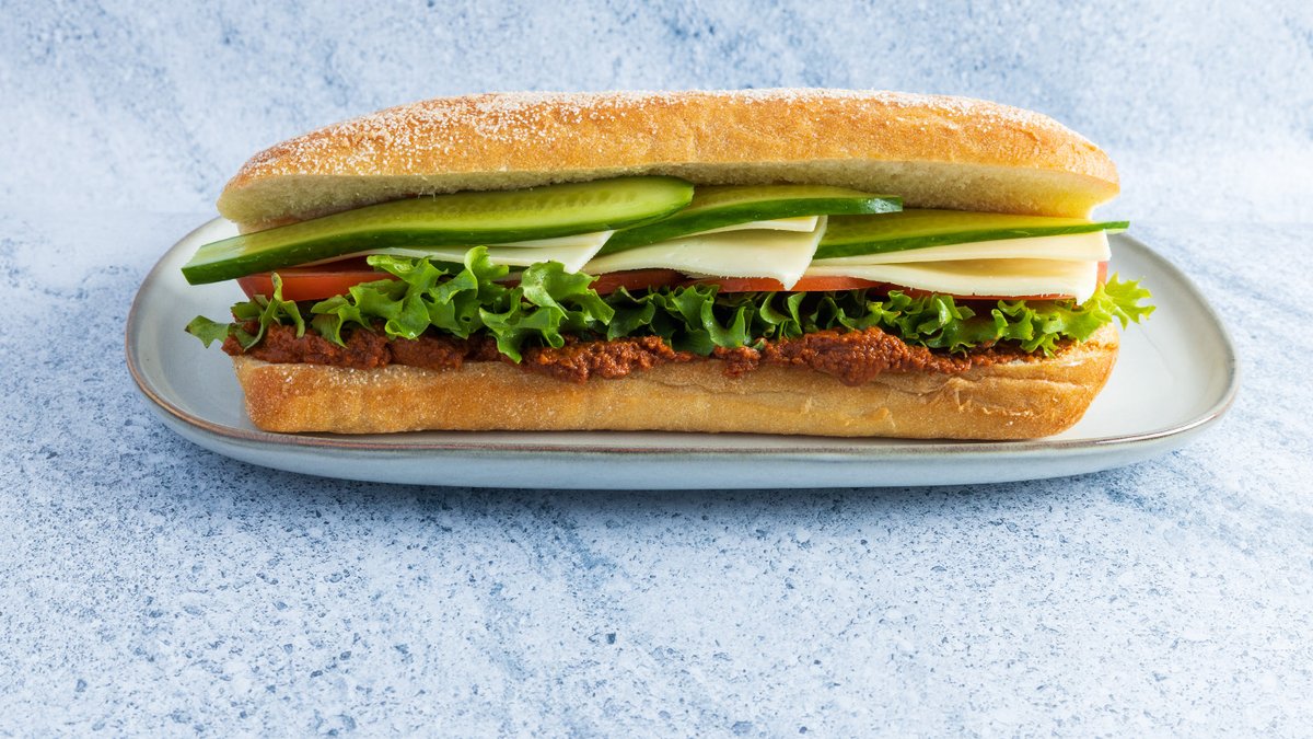 ממרח עגבניות מיובשות , גבינת גאודה , עגבניות חסה ומלפפון טרי