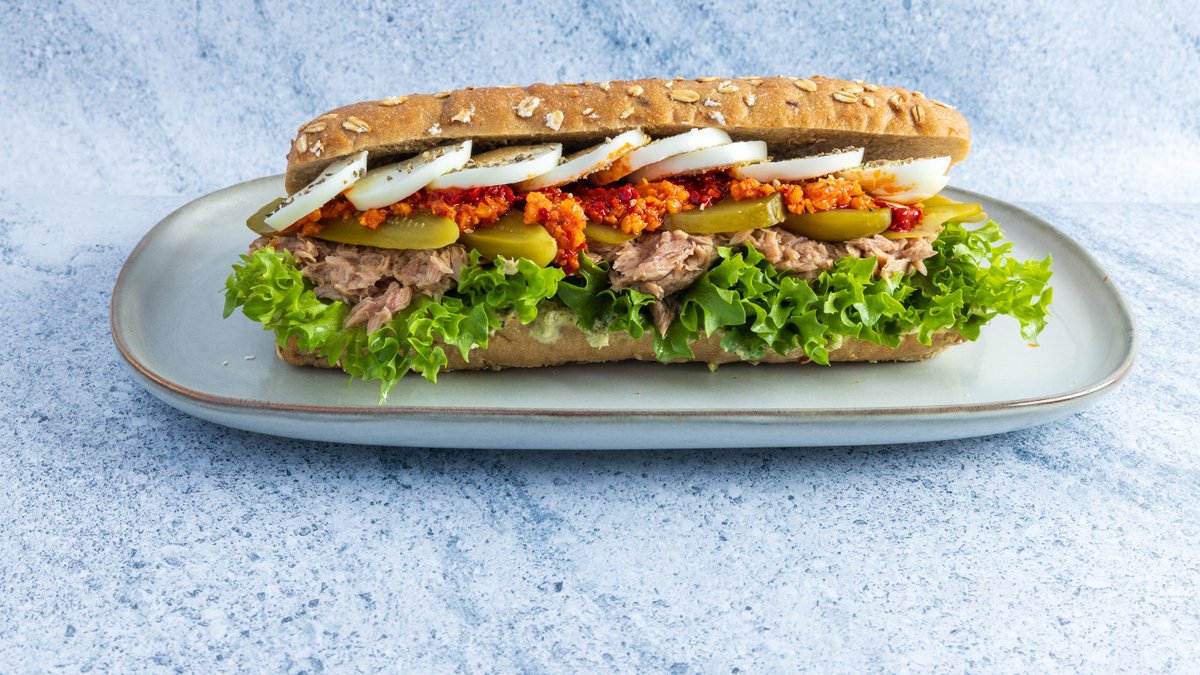 טונה , אריסה , ביצה קשה, מלפפון חמוץ ורוקט