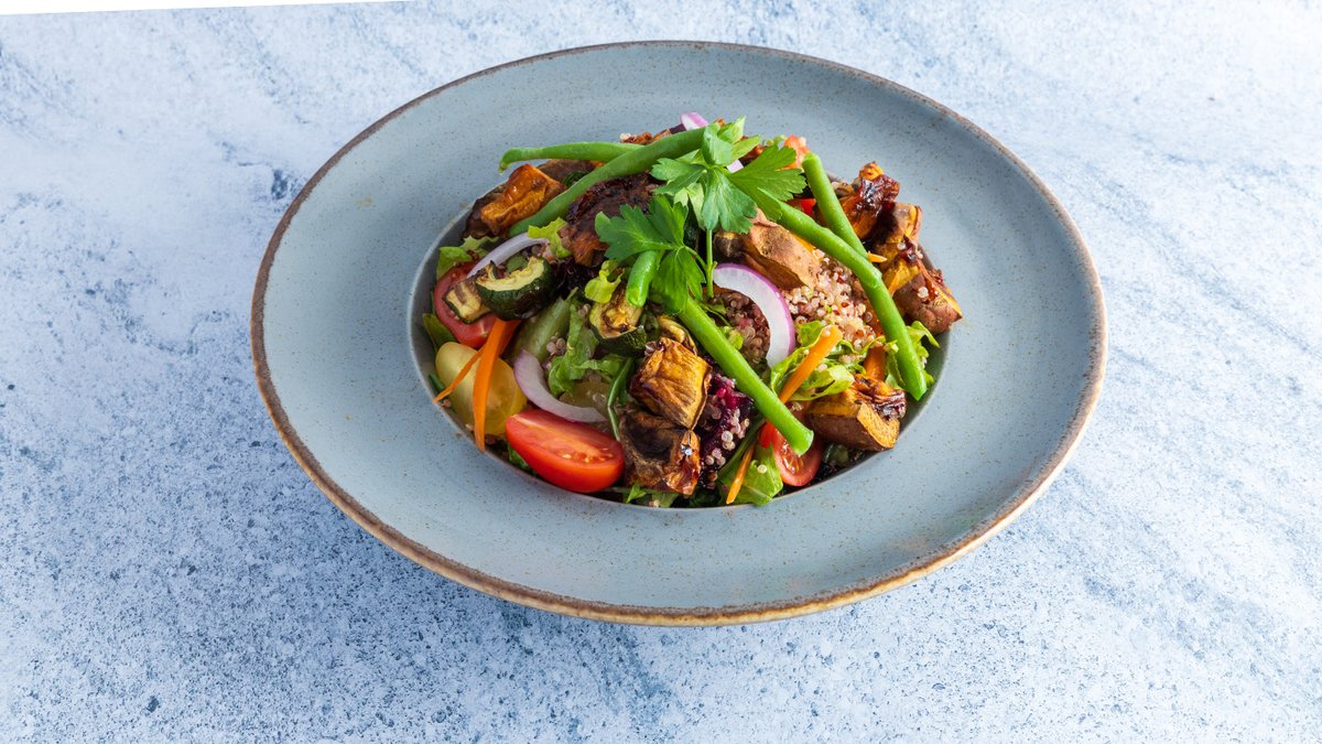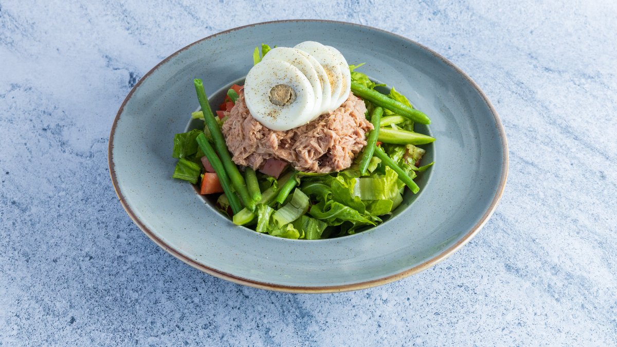 חסה, עגבניה, מלפפון, ביצה קשה, טונה, שעועית ירוקה ורוקט