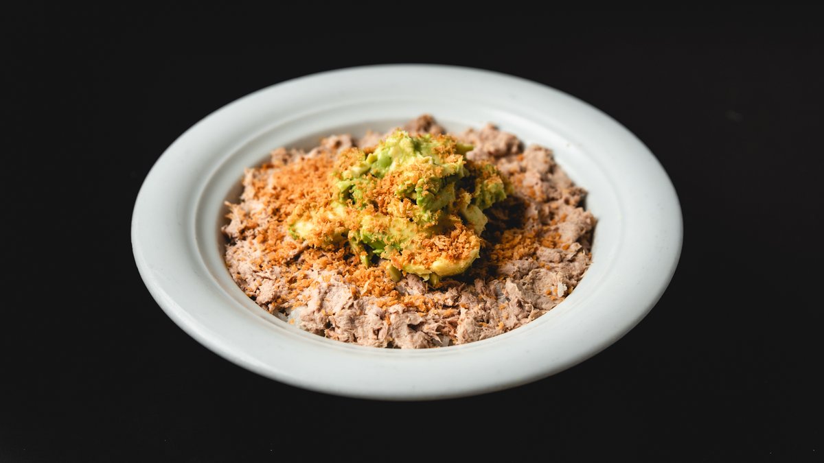 אורז סושי, סלט טונה במיונז, קוביות אבוקדו, שבבי פנקו ורוטב טריאקי