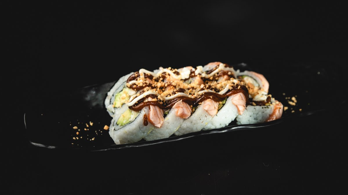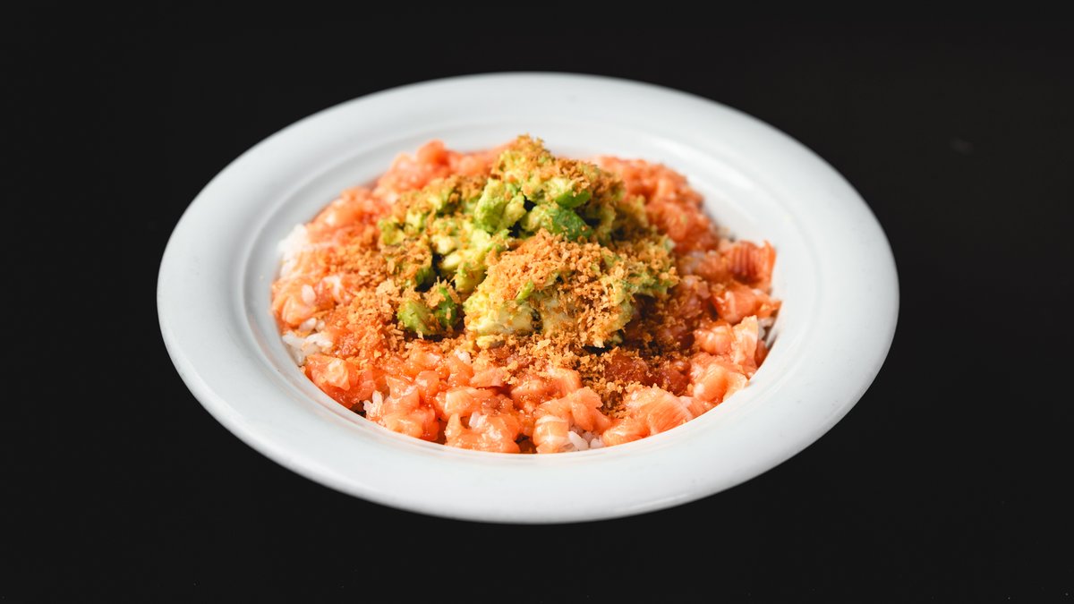 אורז סושי, סלמון, קוביות אבוקדו, שבבי פנקו ורוטב טריאקי
