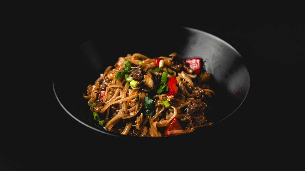 אטריות אורז עם תוספת, פטריות, בצלים, גמבה ונבטים . מנה חריפה ומתקתקה.
