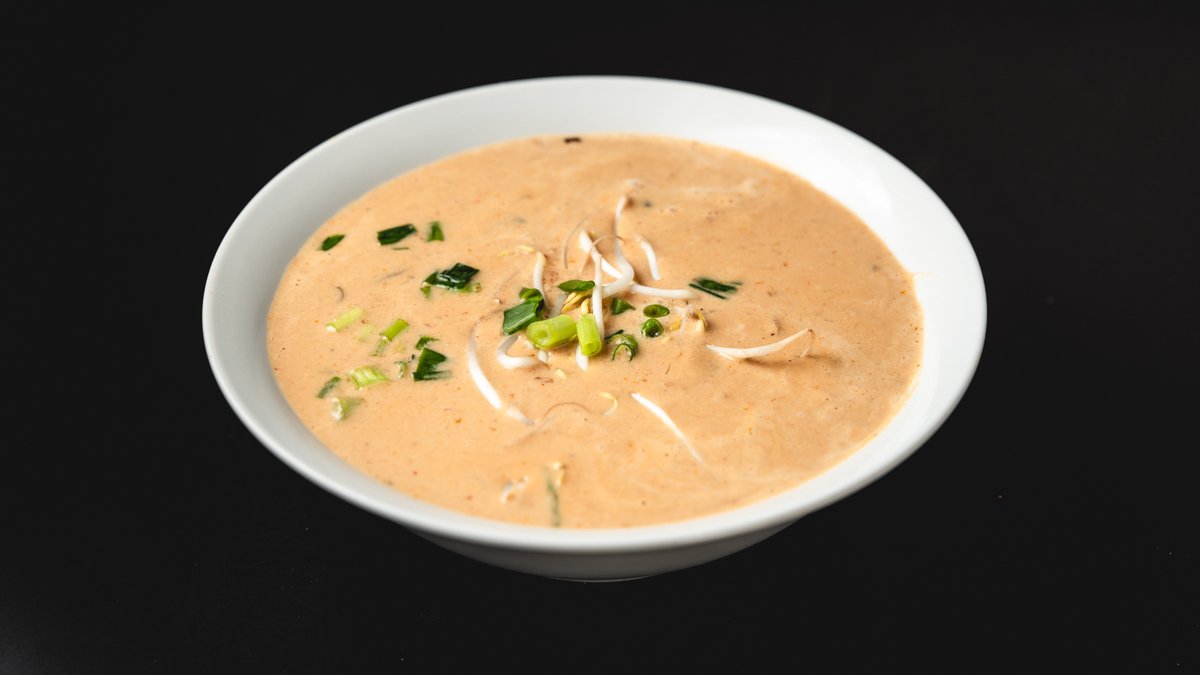 מרק עוף אסייתי עם נתחי עוף, אטריות אורז, נבטים, פטריות ובצל ירוק מתובל בקארי וחלב קוקוס | בחרו גודל למרק. מנה חריפה