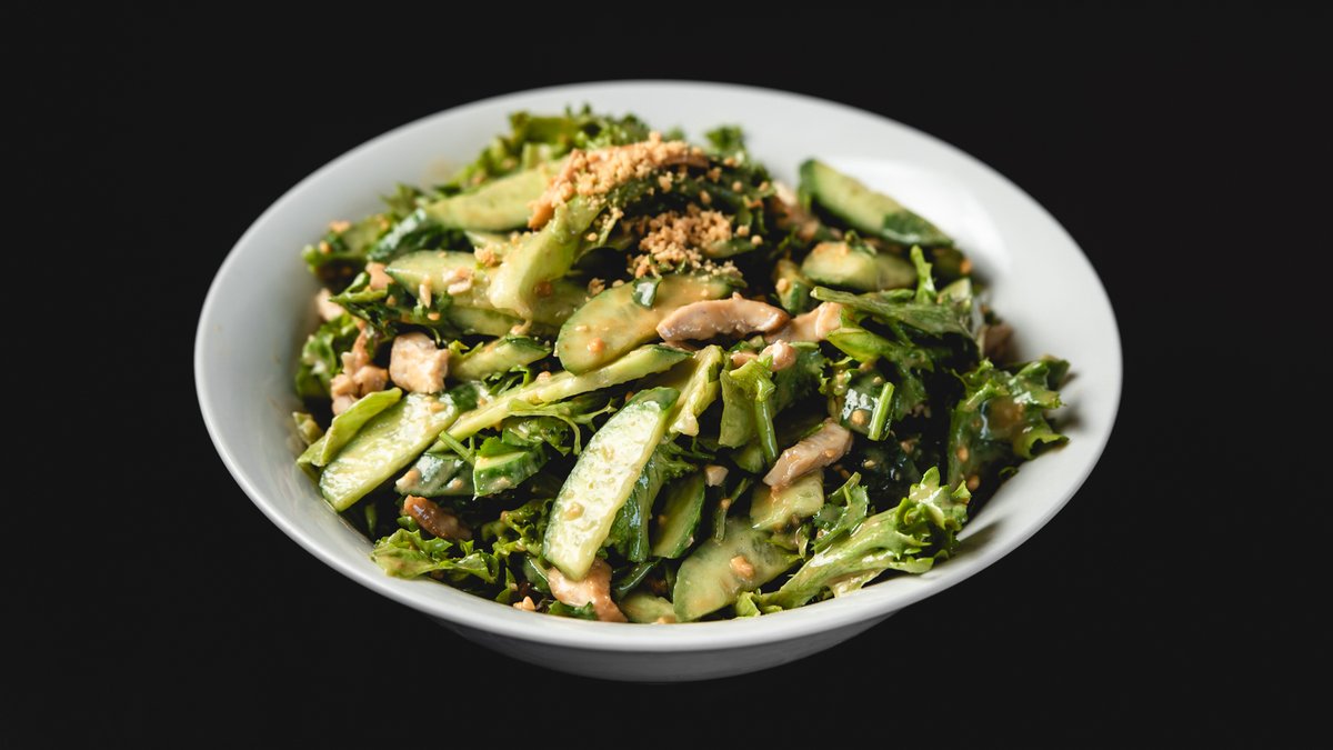 נתחי עוף בטריאקי, מיקס עלים, מלפפונים וכוסברה ברוטב חמאת בוטנים עם קריספי ושבבי בוטנים