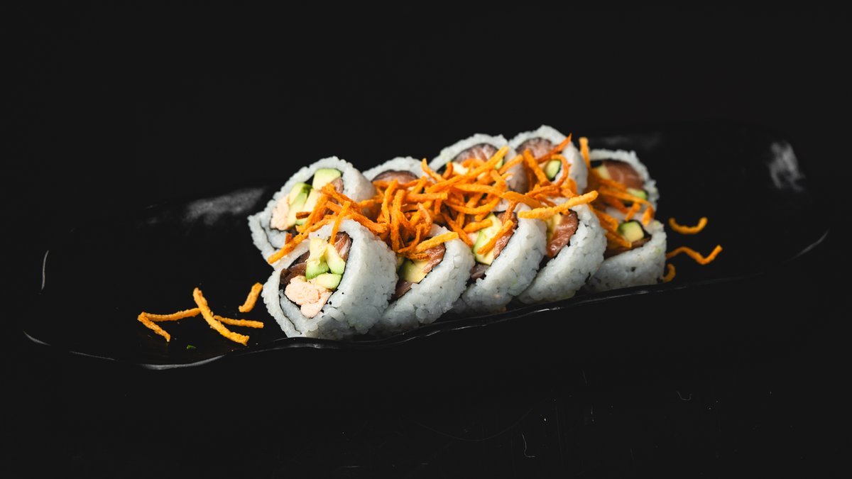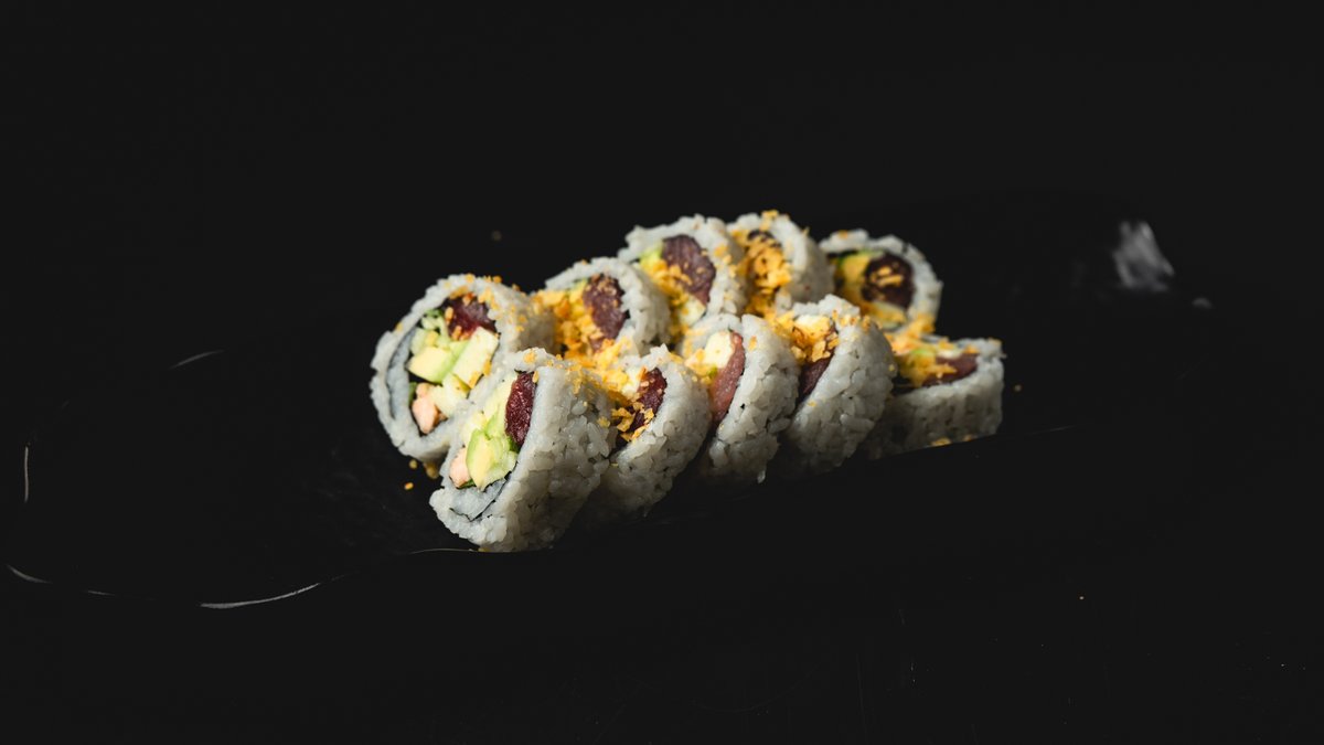 פוטומאקי סלמון, טונה אדומה ודניס עם אבוקדו, בצל ירוק, קראנץ' טמפורה וגרידת לימון | 10 יח׳