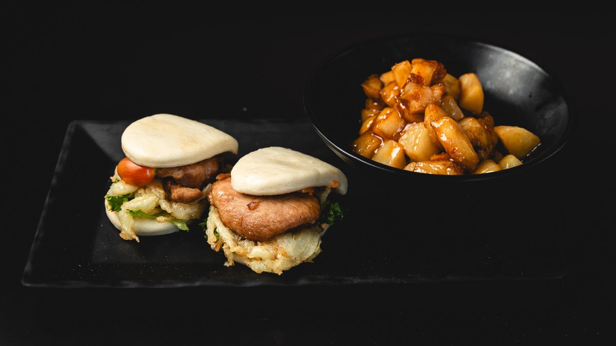 2 יח׳ באן עם פילה דניס קריספי בטמפורה, איולי הדרים פיקנטי, חסה ובצל מטוגן | מוגש עם תוספת לבחירה