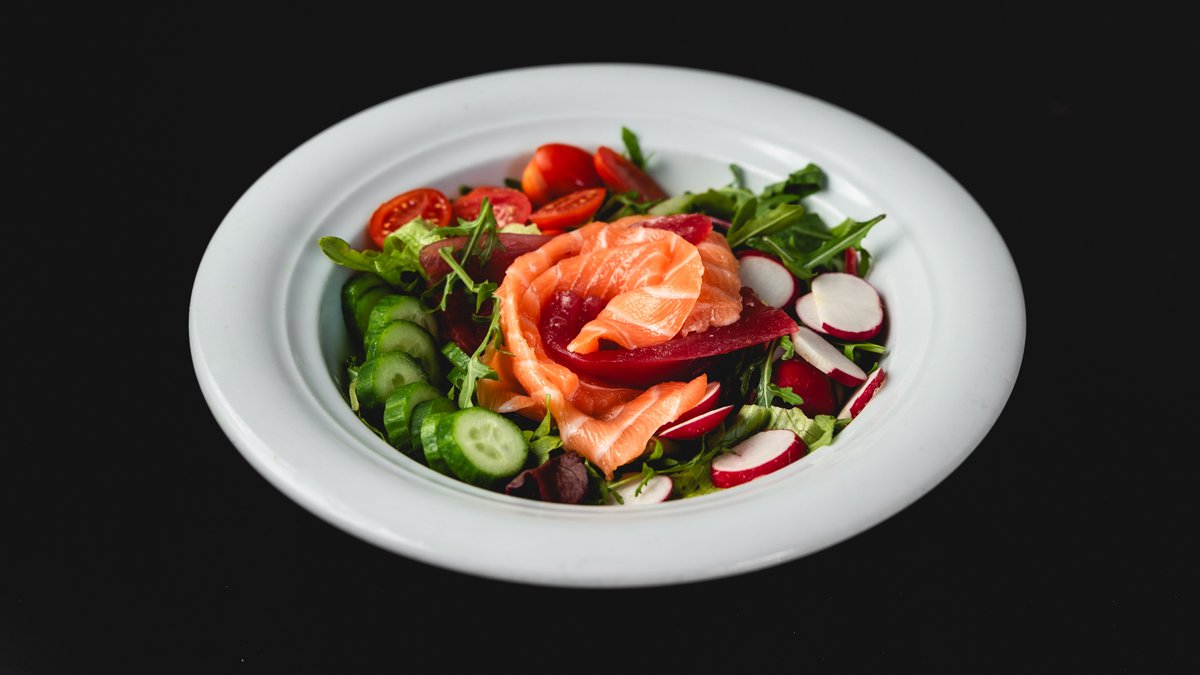 פילה סלמון וטונה אדומה טריים, עלי חסה, עלי בייבי, צנון, מלפפון ועגבניות שרי ברוטב ווינגרט לימוני רענן