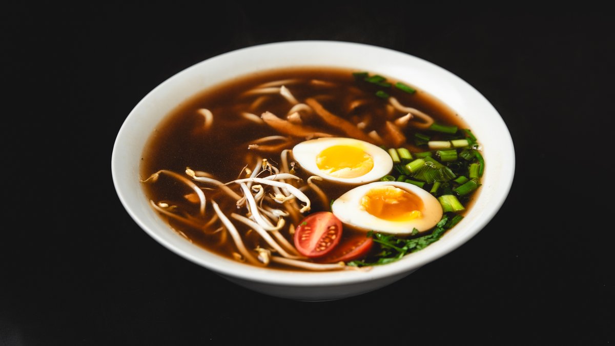 ציר עוף אמיתי, ביצה רכה, אטריות אודון, חזה עוף בטריאקי, בצל ירוק ונבטים