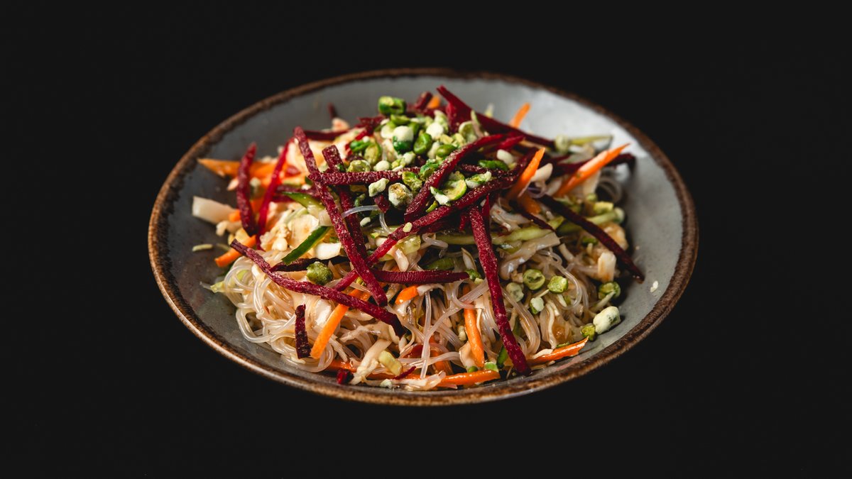 מקלוני גזר, כרוב, מלפפון, נבטים, בצל ירוק ואטריות שעועית ברוטב ווינגרט לימון-צ'ילי ואפונת וואסבי מעל