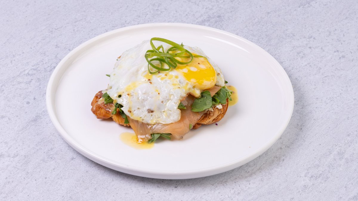 קרואסון חמאה, סלמון מעושן, גבינת שמנת, רוקט, אבוקדו, ביצת עין, בצל ירוק ורוטב הולנדייז