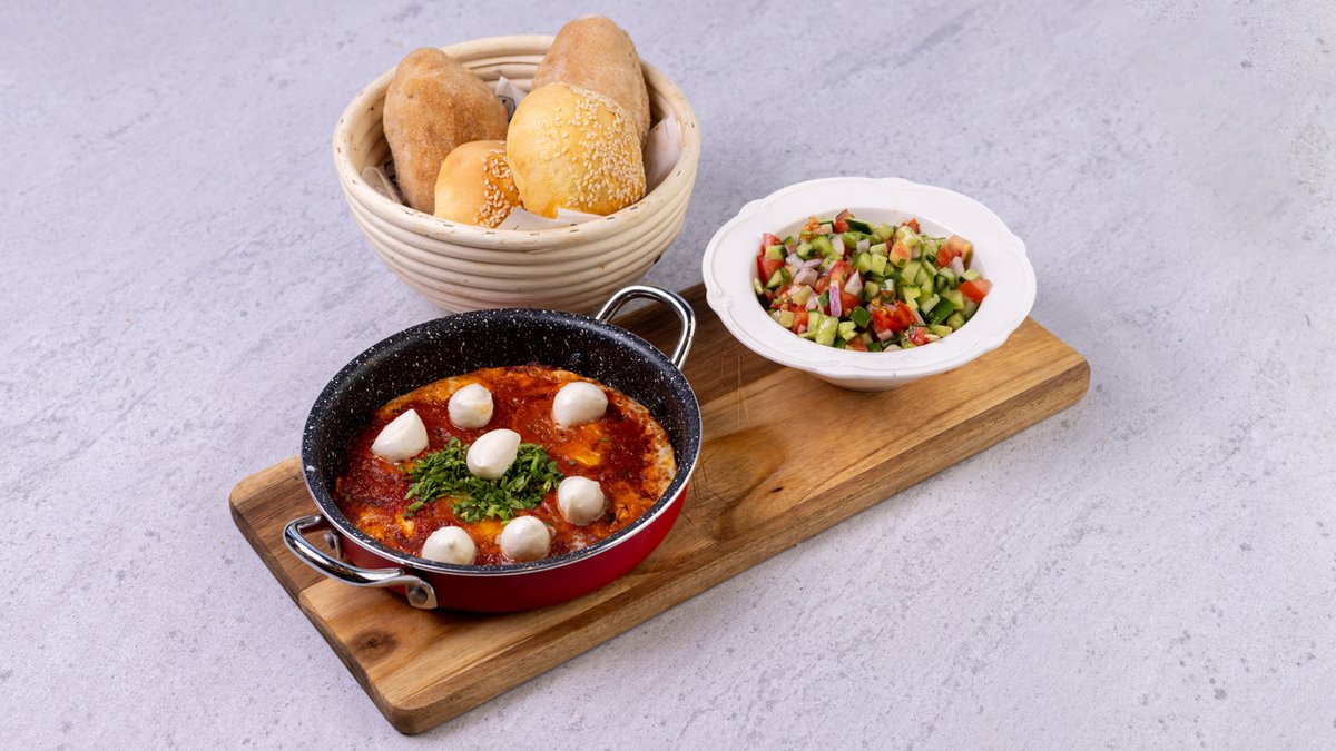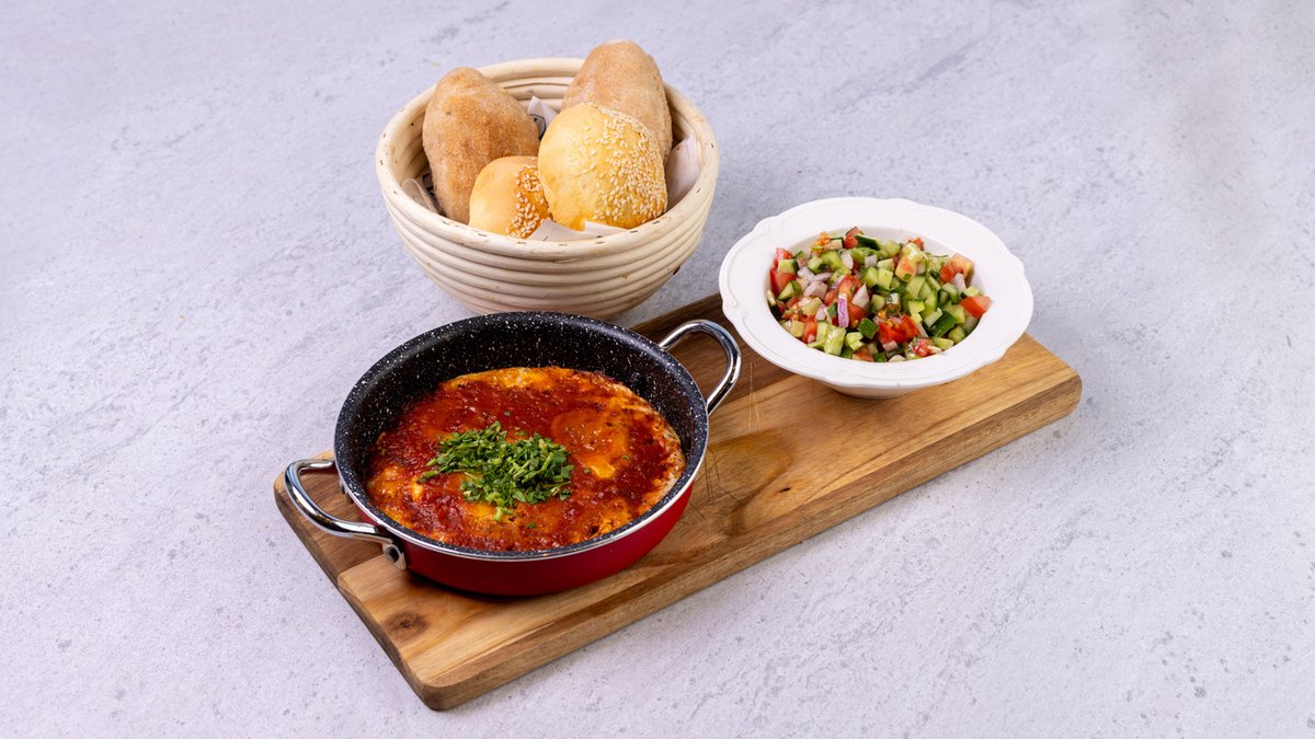 תבשיל עגבניות עשיר עם ביצים מוגש עם סלט ולחם לבחירה