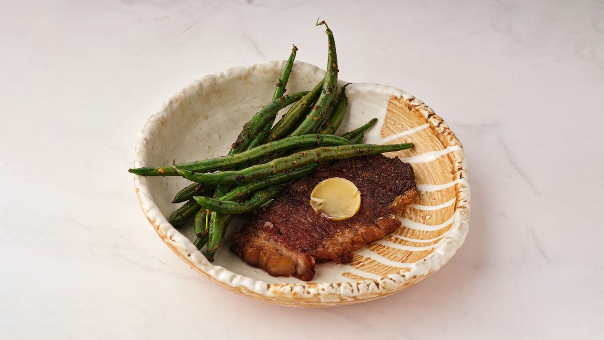 סטייק סינטה פרוס מעל מדורה של חמאה מזוקקת, צ’ימיצ’ורי אסייתי מוגש עם תוספת לבחירה