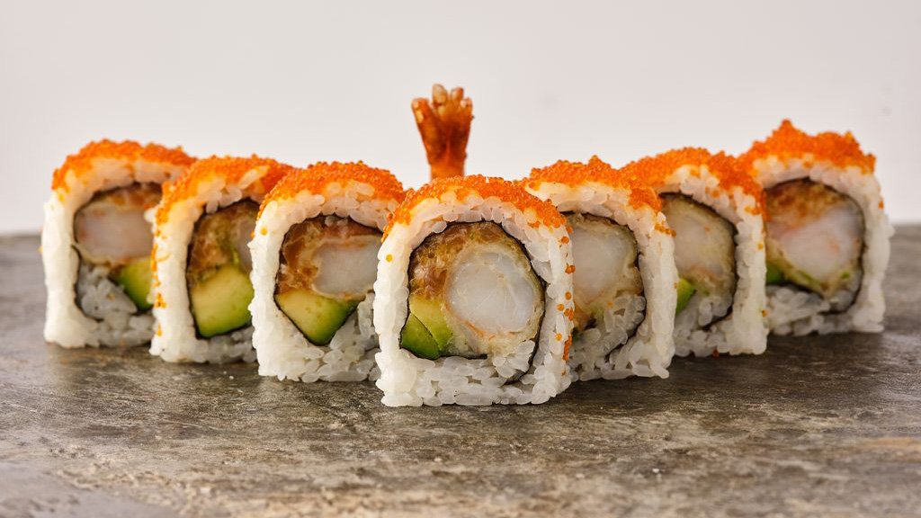 שרימפס בטמפורה, ואבוקדו בציפוי טוביקו כתום