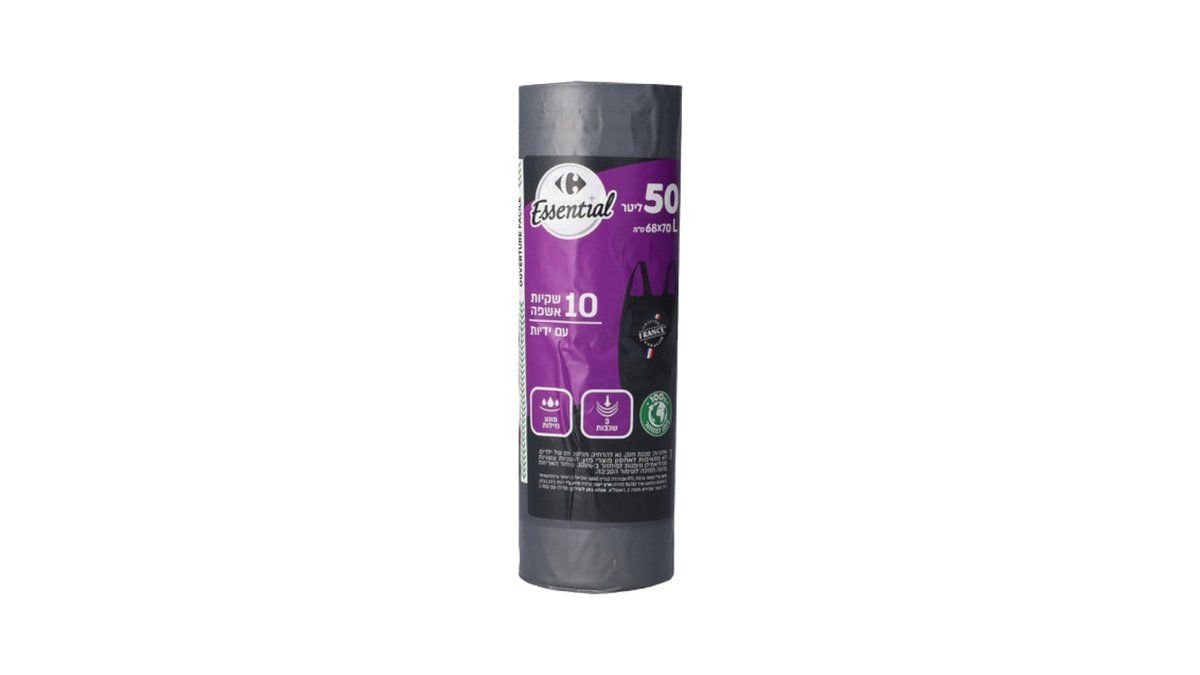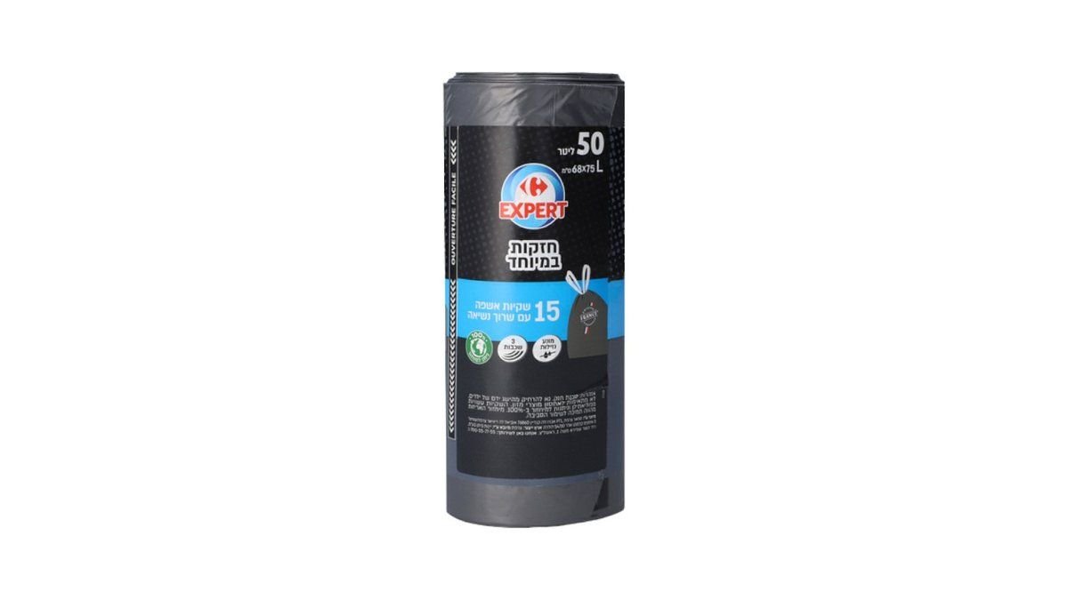 קרפור אקספרט 15 שקיות אשפה 50 ליטר חזקות במיוחד עם שרוכים נמתחים 100% ניתנות למיחזור