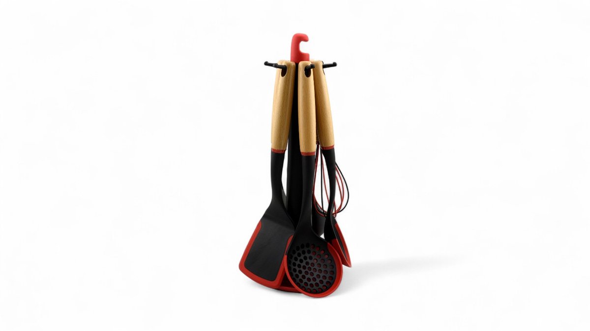 כלי ששת ניילון אדום ידית עץ סט (7) על מעמד | סולתם