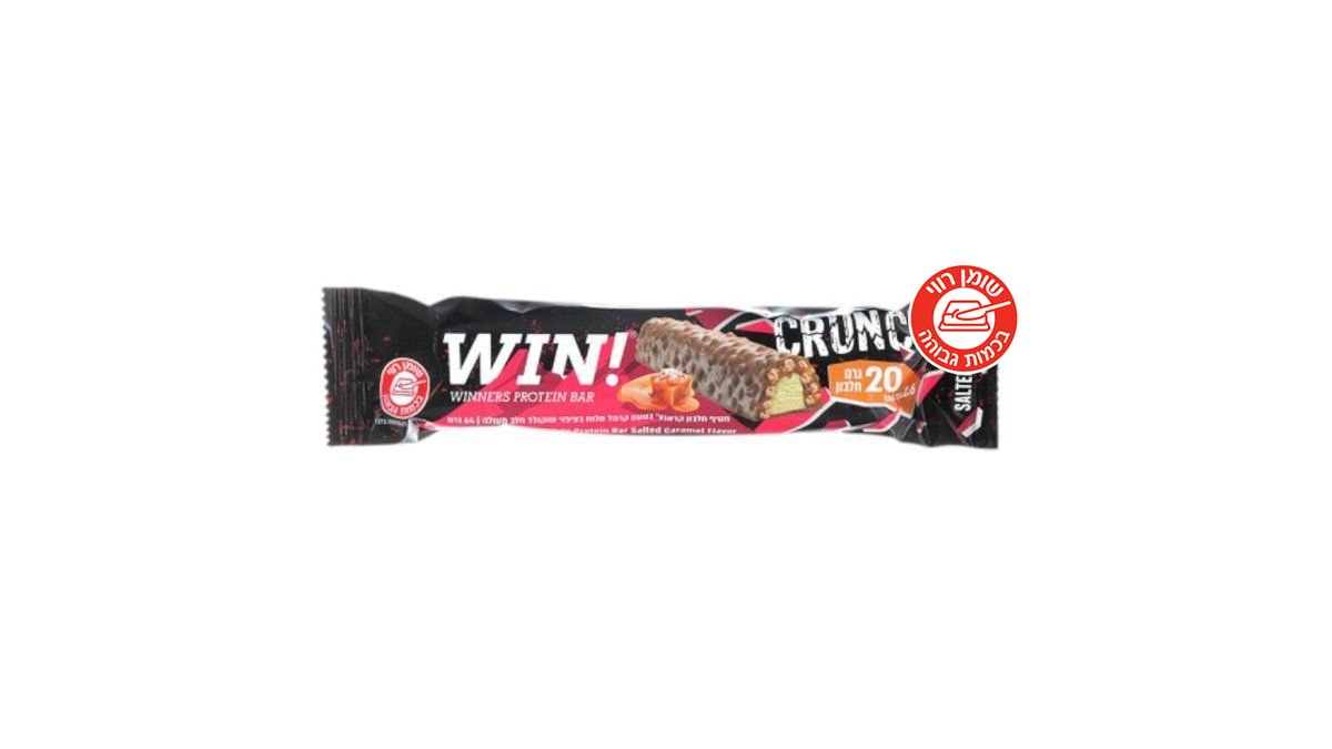WIN חטיף חלבון קראנצ׳ בטעם קרמל מלוח בציפוי שוקולד חלב מעולה 64 גרם