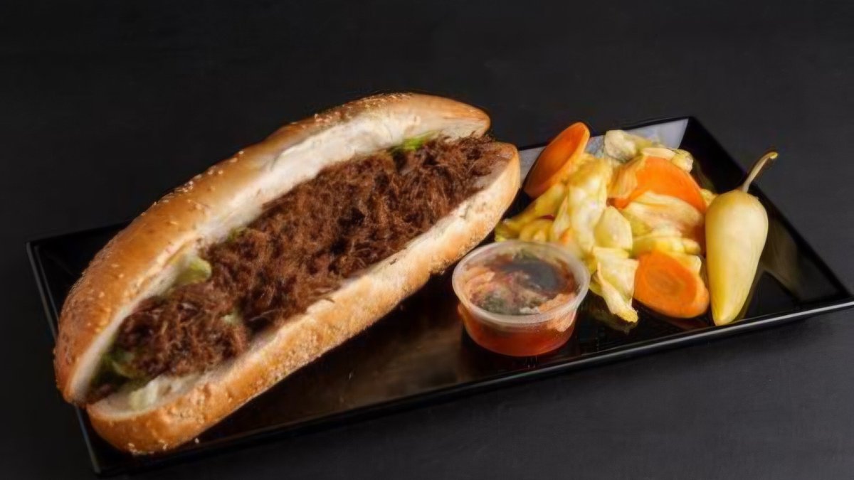 נתחי אסאדו בבישול ארוך עם בצל מקורמל מוגשים בבאגט פריך עם סלטי הבית לבחירה