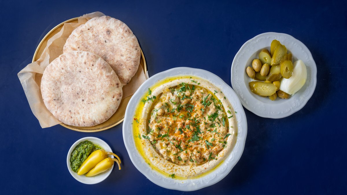 גרגירים חמים, טחינה, כמון, רוטב שום לימון, פטרוזיליה ושמן זית.