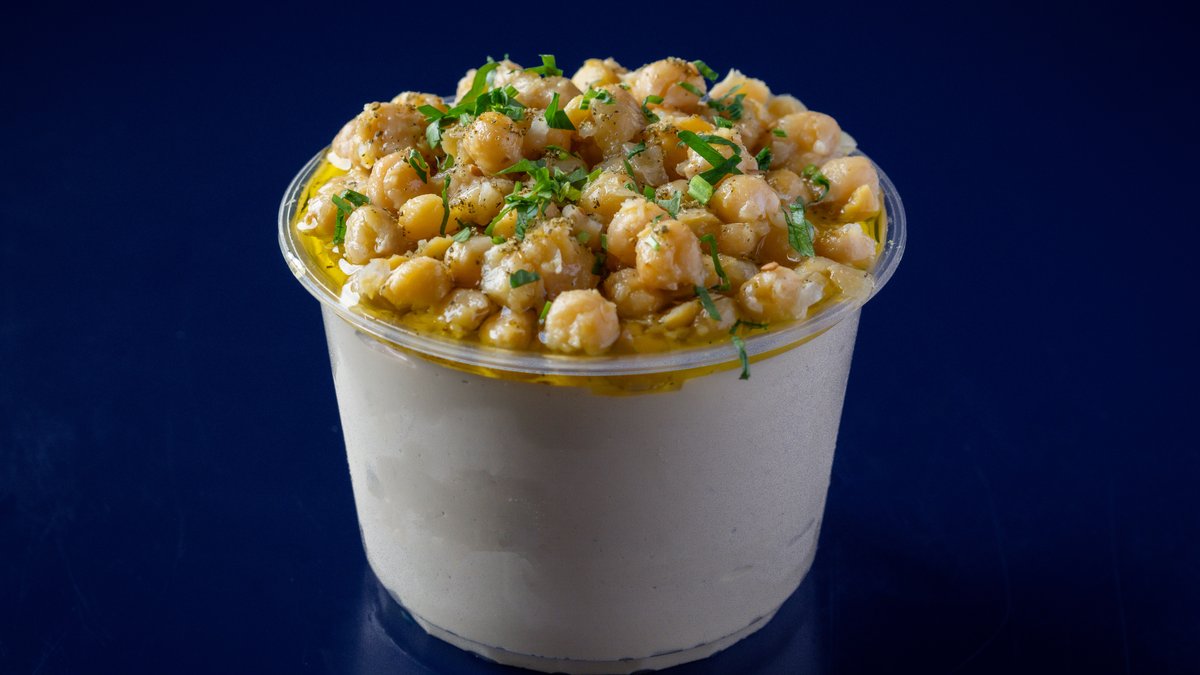 גרגירים חמים מרוסקים, טחינה, תבלינים, רוטב שום לימון, פטרוזיליה ושמן זית.
