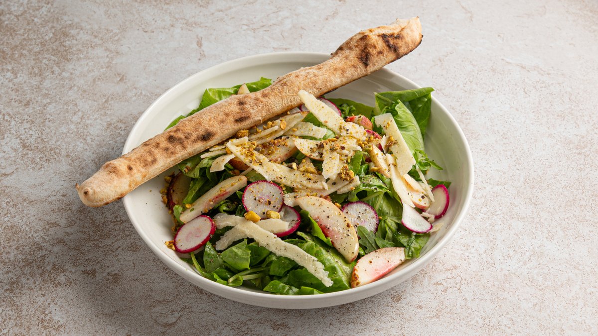 תערובת ירוקים, פרי עונתי, צנונית, וינגרט בזיליקום, שבבי גרנה פדנה, מוגש עם מקל לחם.