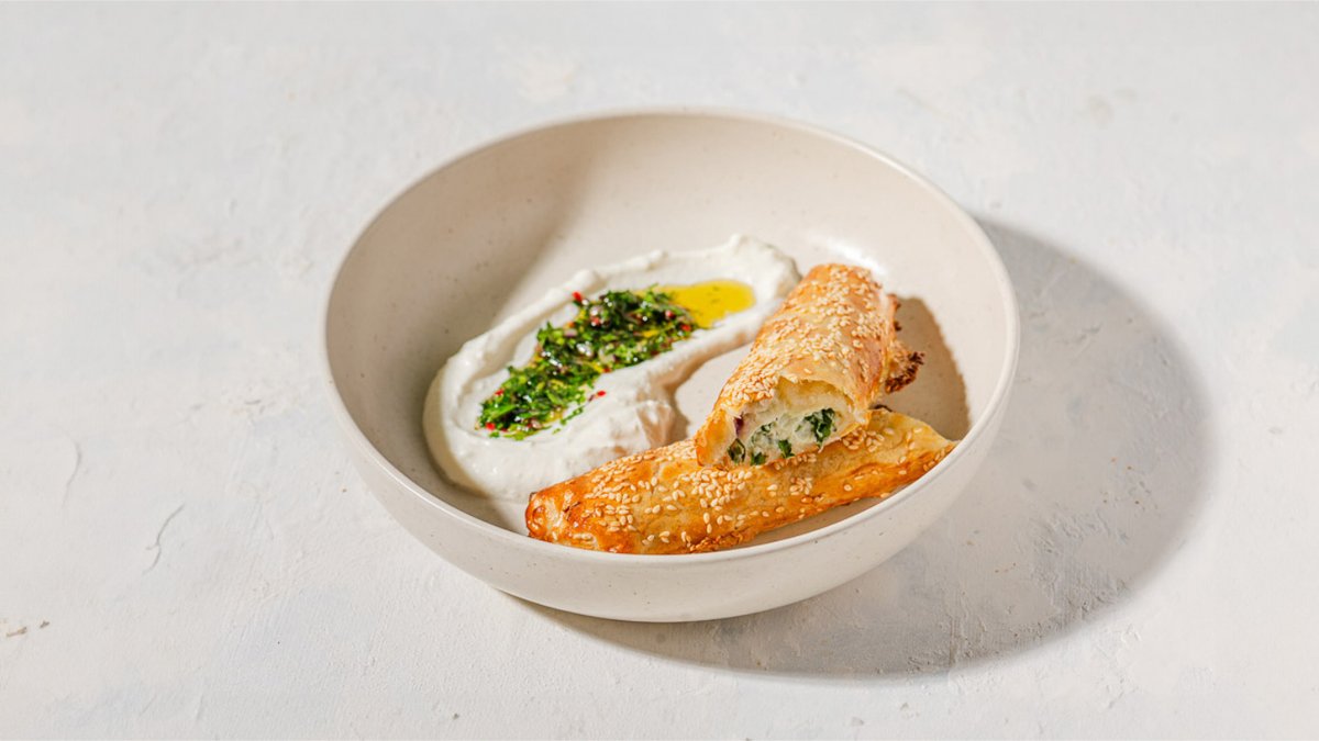 בצק פילאס אפוי במילוי תרד וג'יבנה, מוגש עם יוגורט עשבים