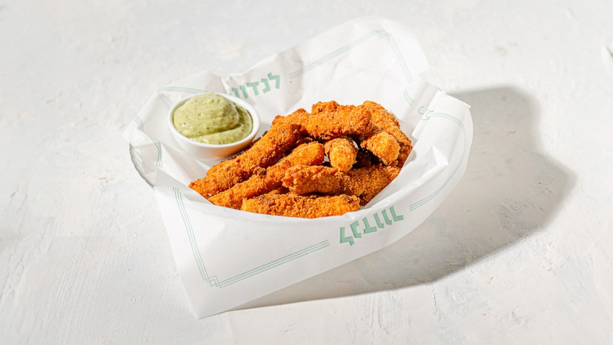 נתחי דג ים מטוגנים בציפוי פריך עם עשבי תיבול ואיולי פסטו. מוגשים עם צ׳יפס