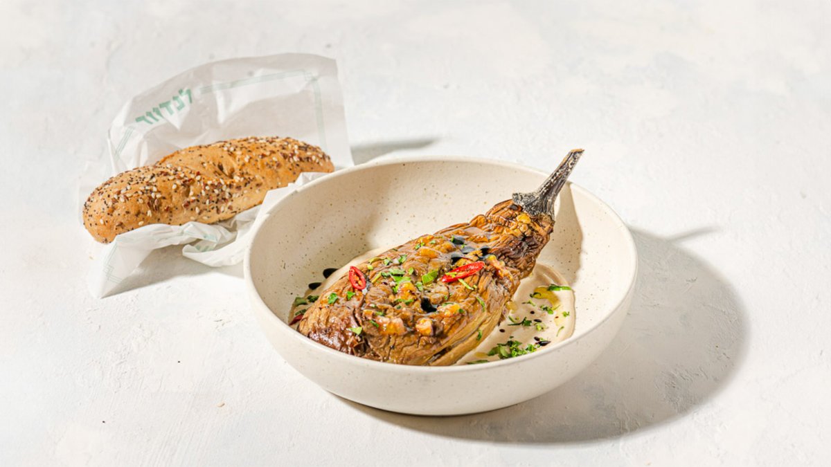 חציל שלם קלוי בתנור עם שמן זית, מוגש עם טחינה, זרעי עגבניה, צ'ילי, פטרוזיליה קצוצה וסירופ בלסמי מצומצם. טבעוני