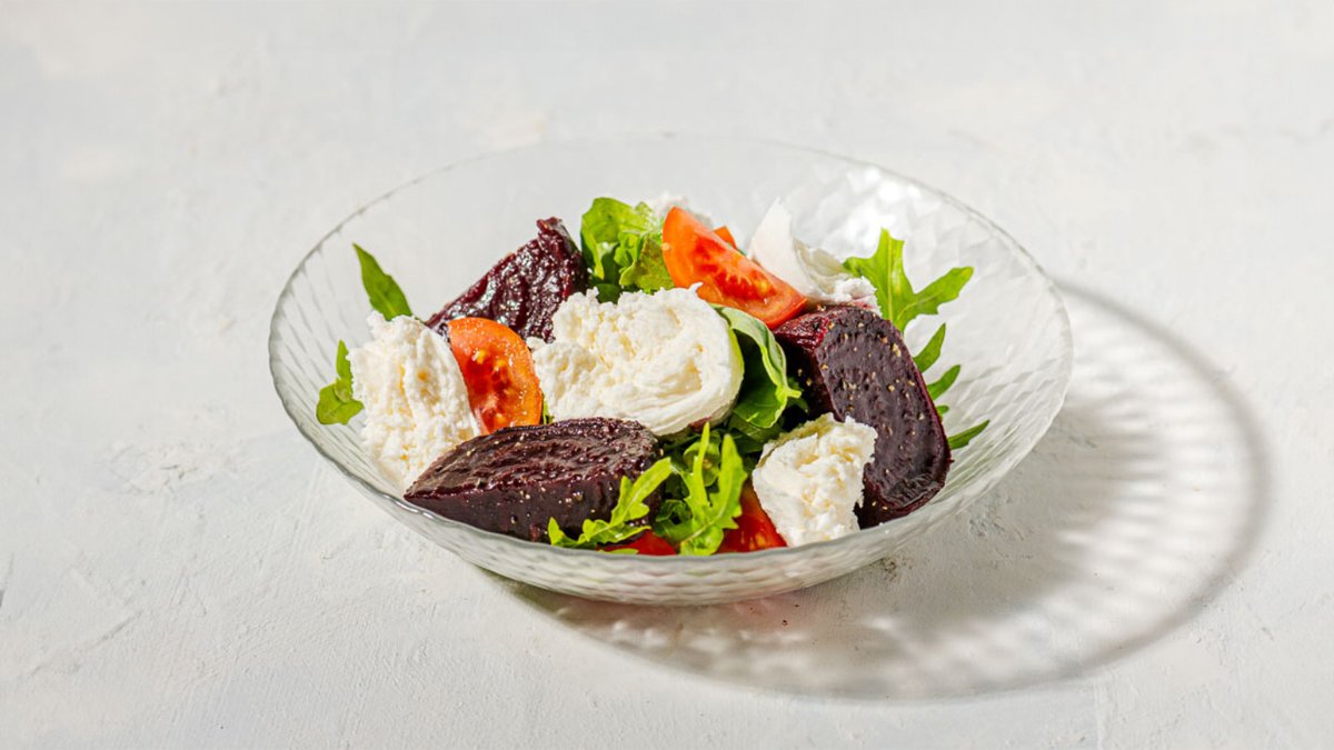 מוצרלה, עגבניות שרי, סלק צלוי, עלי בזיליקום ורוקט בויניגרט בלסמי