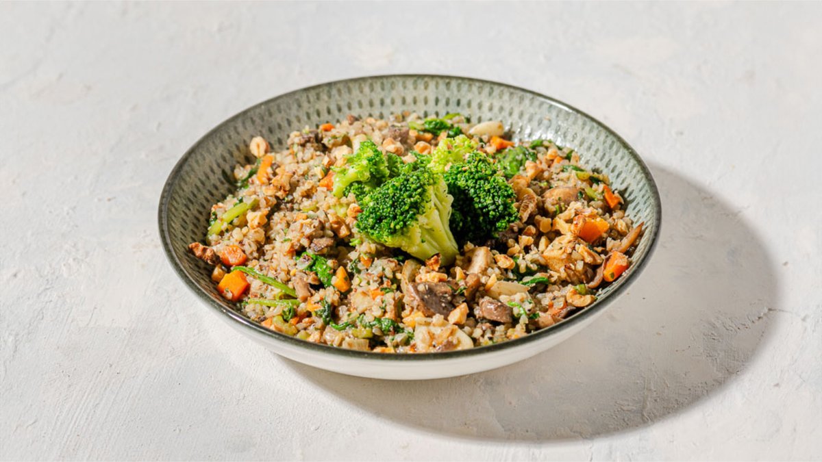 כוסמת ובורגול עם טופו, פטריות, ברוקולי, תרד, ירקות שורש, אגוזי מלך, עשבי תיבול, טחינה וסילאן