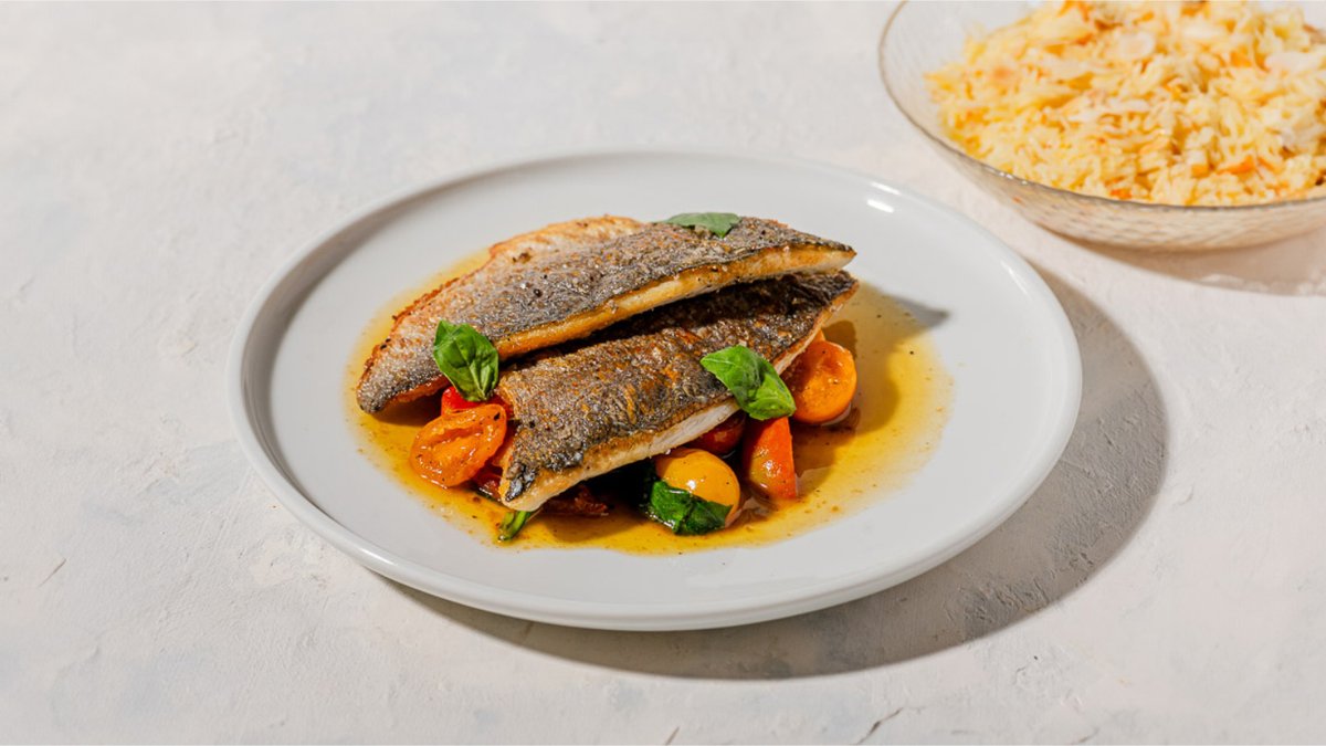 צמד פילה דניס צלויים בתנור ברוטב של סוכריות עגבניות שרי, בזיליקום ויין לבן עם תוספת לבחירה