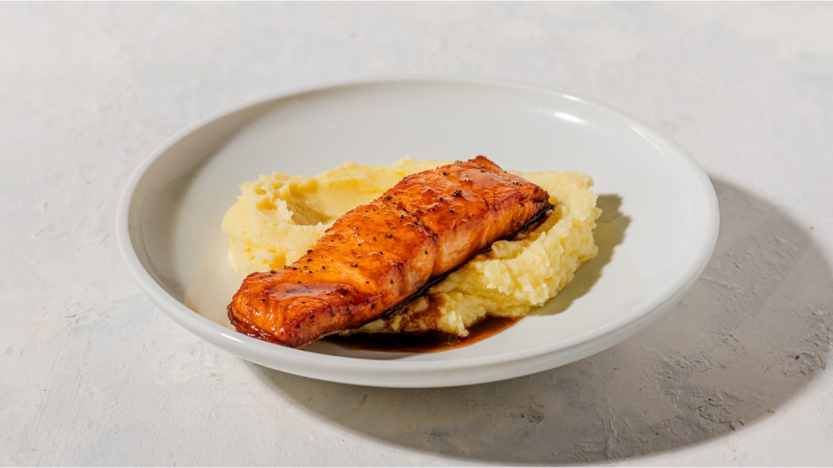 פילה סלמון ברוטב מתקתק של סילאן והדרים, מוגש עם תוספת לבחירה