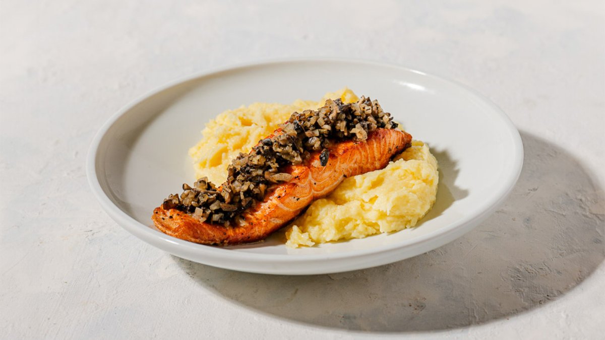 פילה סלמון צלוי בתנור, מוגש עם פטריות קצוצות ומחית כמהין שחורה ותוספת לבחירה