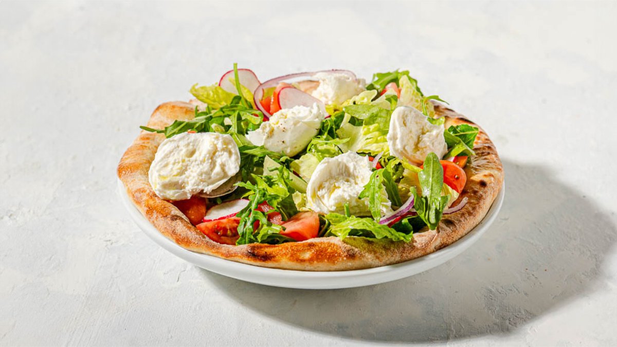 מוצרלה טרייה, מיקס עגבניות, פלפלים קלויים, חסה, ארוגולה, בצל סגול וצנוניות בויניגרט בלסמי. מוגש לצד פוקאצ׳ה טריה