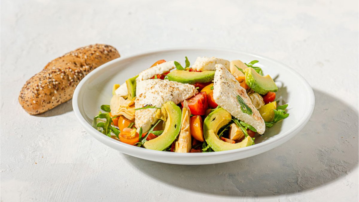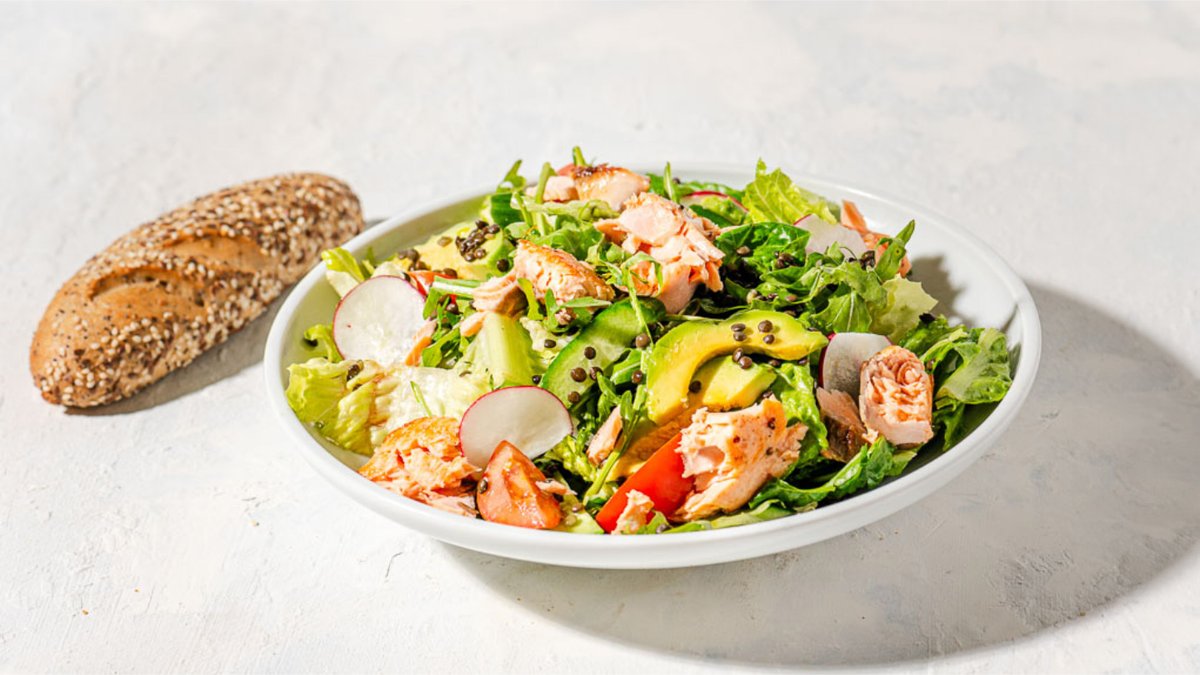 עגבניות שרי, מלפפונים, חסה, ברוקולי, צנוניות ואבוקדו בויניגרט נענע ולימון עם נתחי סלמון צלויים בגריל מוגש עם לחמניה מהבייקרי של לנדוור