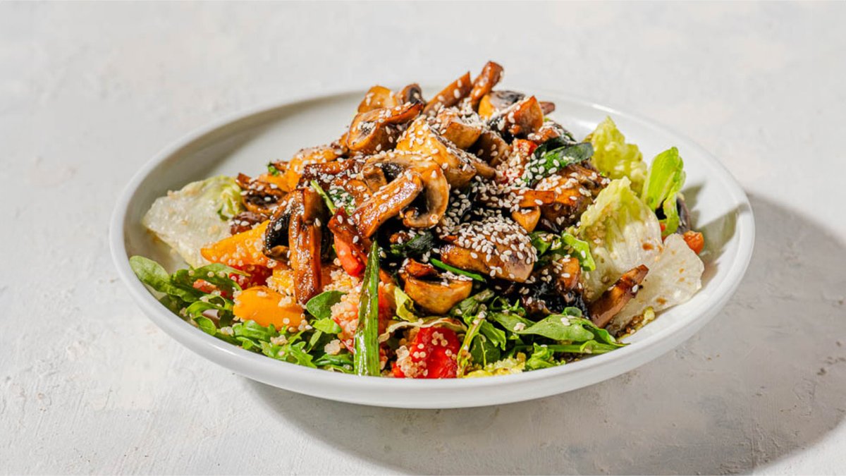 פטריות ובצל ירוק, קינואה, פלפל קלוי, עגבניות שרי, גזר, רוקט, חסה, בזיליקום ושומשום ברוטב סילאן הדרים