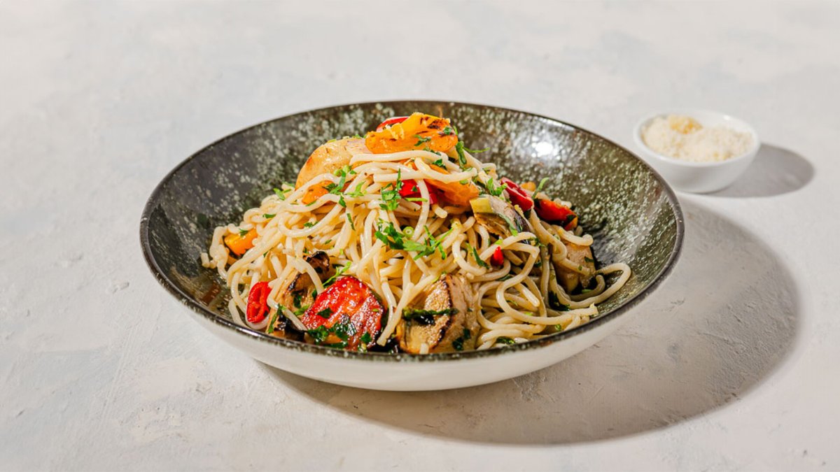 ספגטי עם לבבות ארטישוק ועגבניות שרי צלויות על בסיס שמן זית, שום, פלפל צ'ילי, פטרוזיליה ומעט גרידת לימון