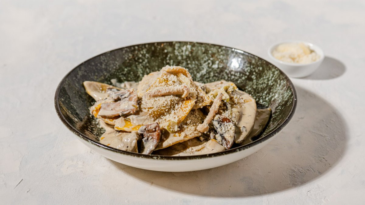 רביולי במילוי קרם פטריות פורטבלו ברוטב שמנת, כרישה, יין לבן ונגיעות כמהין