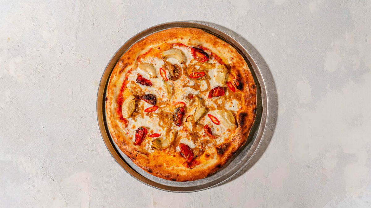 רוטב עגבניות עם מוצרלה ארטיג'ינאלה, ארטישוק, בצל מקורמל, עגבניות שרי צלויות וצ'ילי