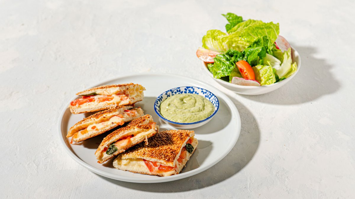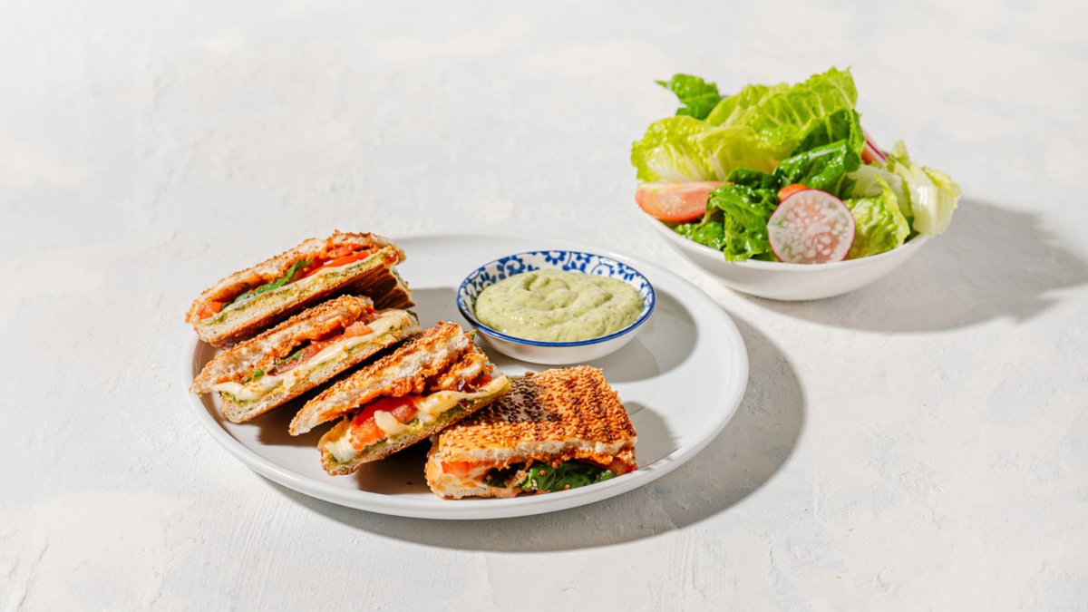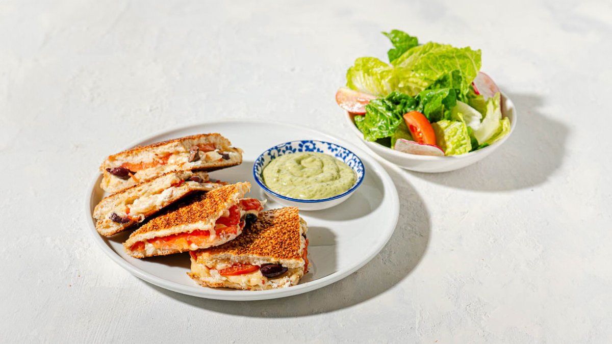 גבינה צהובה, גבינה בולגרית, עגבנייה, בצל בזעתר וזיתי קלמטה. מוגש עם סלט ירוק ואיולי פסטו