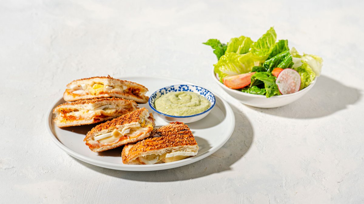 גבינה צהובה, ביצה קשה, ממרח עגבניות מיובשות וזעתר. מוגש עם סלט ירוק ואיולי פסטו
