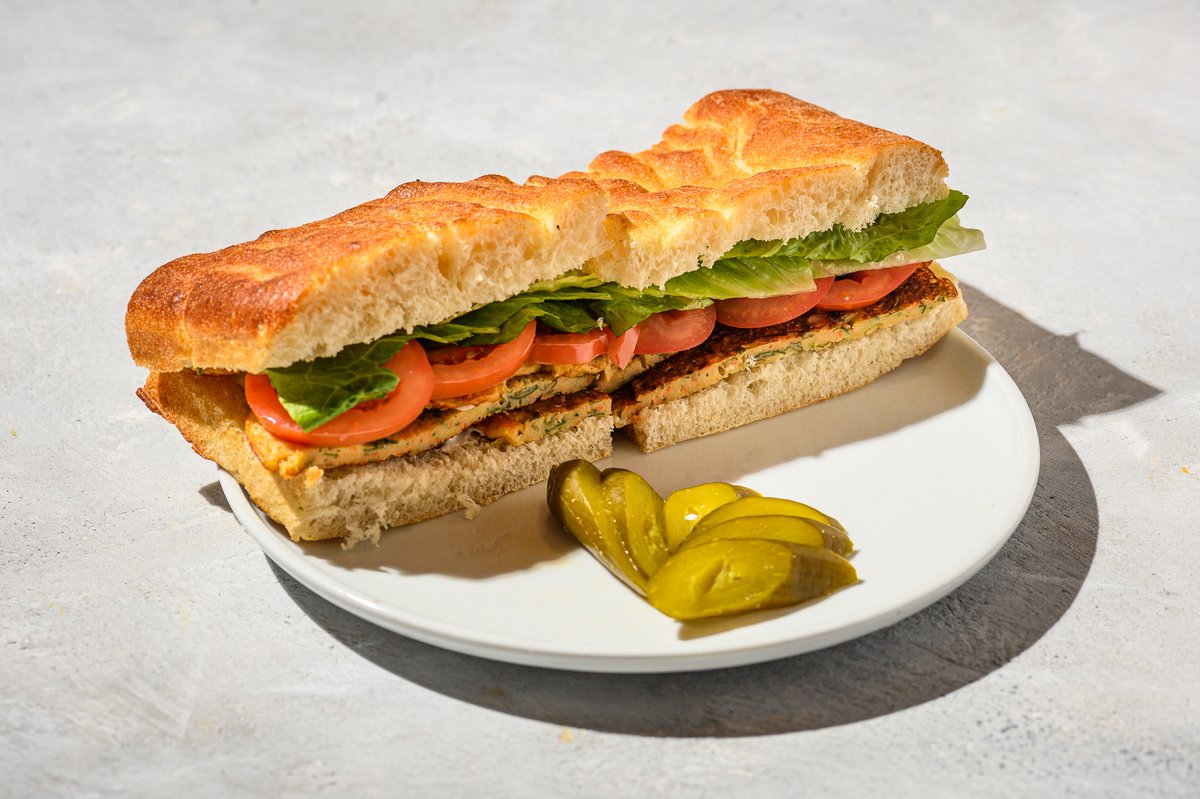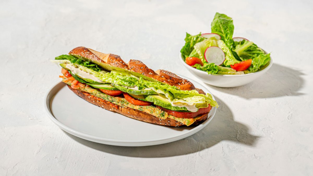 פוקצ'ה חמימה עם חביתת עדשים ותרד, טחינה, ממרח עגבניות מיובשות, חסה ועגבנייה עם מלח ים. טבעוני