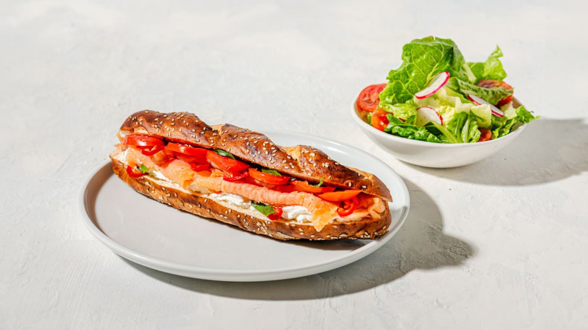מלפפון, עגבנייה, חסה וגבינת שמנת/טחינה. (לבחירה לחמניית חלה / לחמניית דגנים)