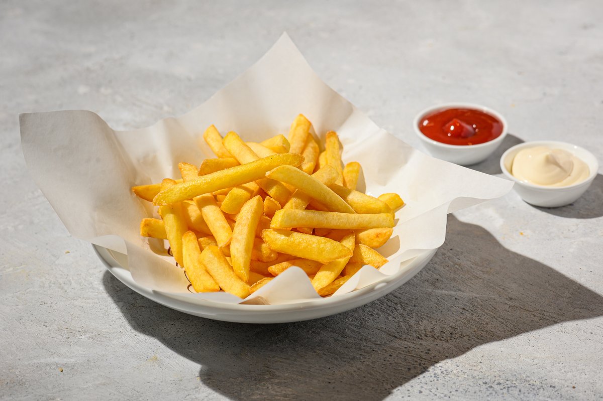 רצועות דג בציפוי פריך מוגשים עם צ'יפס, קטשופ וירקות טריים חתוכים