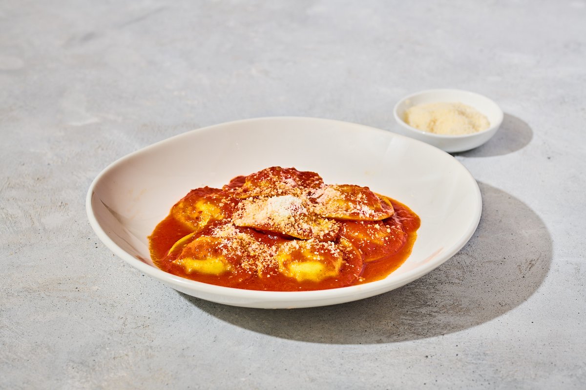 רביולי במילוי קרם מסקרפונה ברוטב חמאת עגבניות עם בזיליקום, שום ופרמז'ן