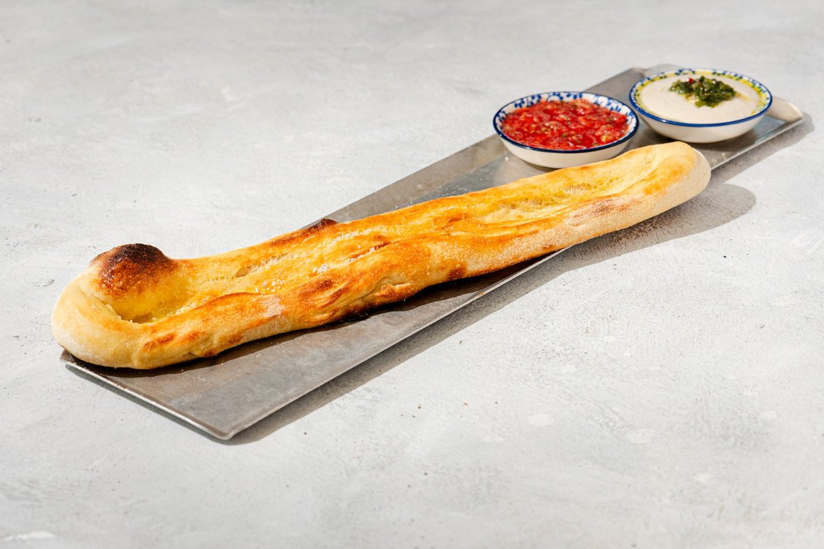 מוגשת עם טחינה עם סלסה ורדה, מטבל עגבניות טריות ועשבי תבלין ושמן זית ובלסמי