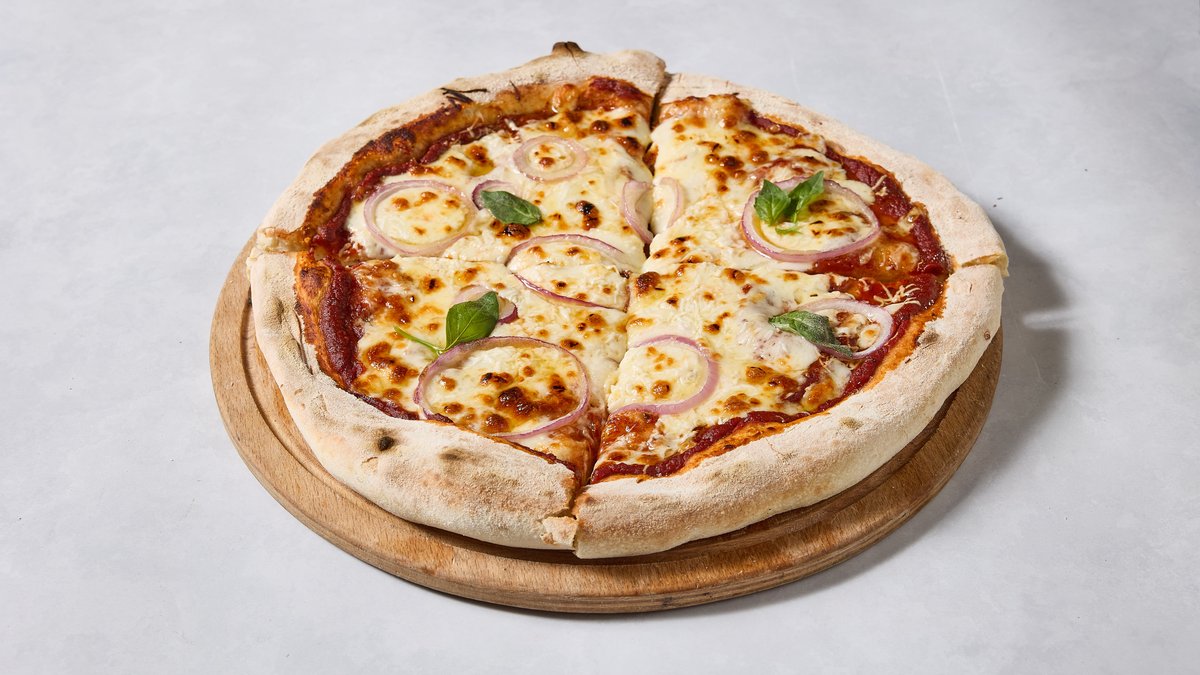רוטב עגבניות, גבינת מוצרלה, גבינת עיזים, בצל מקורמל, שמן זית, בזיליקום