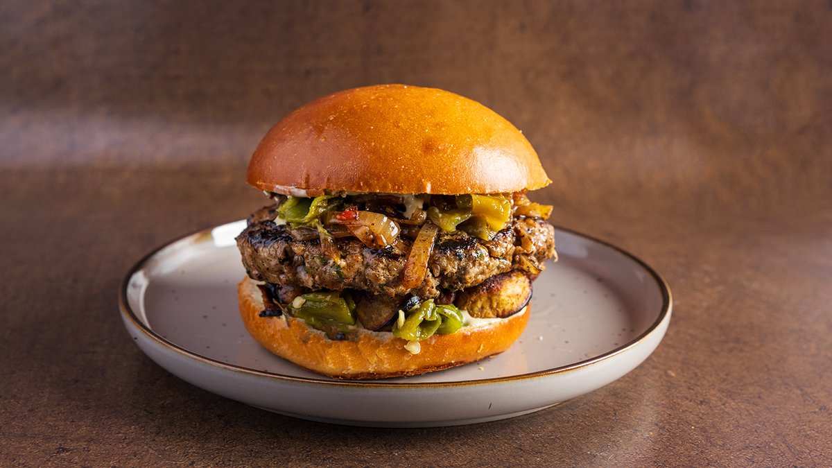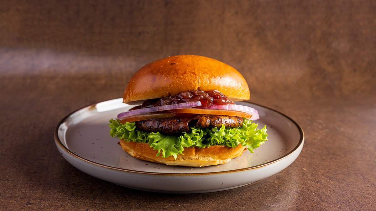 פטריית פורטובלו עם ריבת בצל, חסה, עגבניה, חמוצים, בצל ורטבים לבחירה