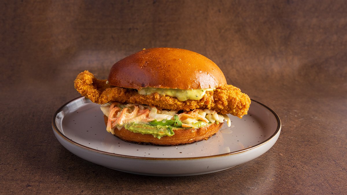 קריספי צ׳יקן עם גוואקמולי, איולי קארי וקולסלואו (ללא ירקות)