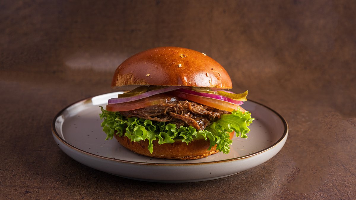 בשר מפורק בבישול ארוך עם חסה, עגבניה, חמוצים, בצל ורטבים לבחירה