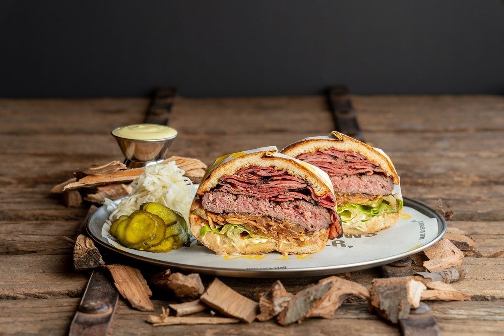 בורגר 225 גר׳, אסאדו מעושן ומפורק מוקפץ עם בצל מקורמל, חרדל, מיונז, צ'ימיצ'ורי, כרוב חמוץ ובצל סגול